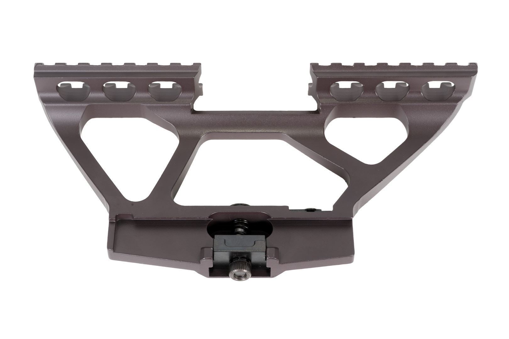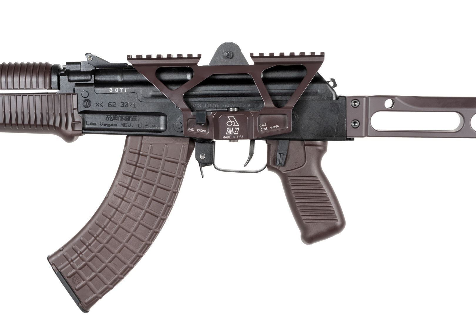 Scope mount for SAM7K SAM7SFK AR-M4SF AR-M14SF TACT and other Arsenal SBR’s and pistols with rear peep sight. The SM-22 features 2.9″ of Picatinny rail play per section 5.8″ total. Low profile one-piece quick release 7 railing slots forward of rear sight and 7 railing slots behind rear sight. Manufactured in the USA by Arsenal Inc.