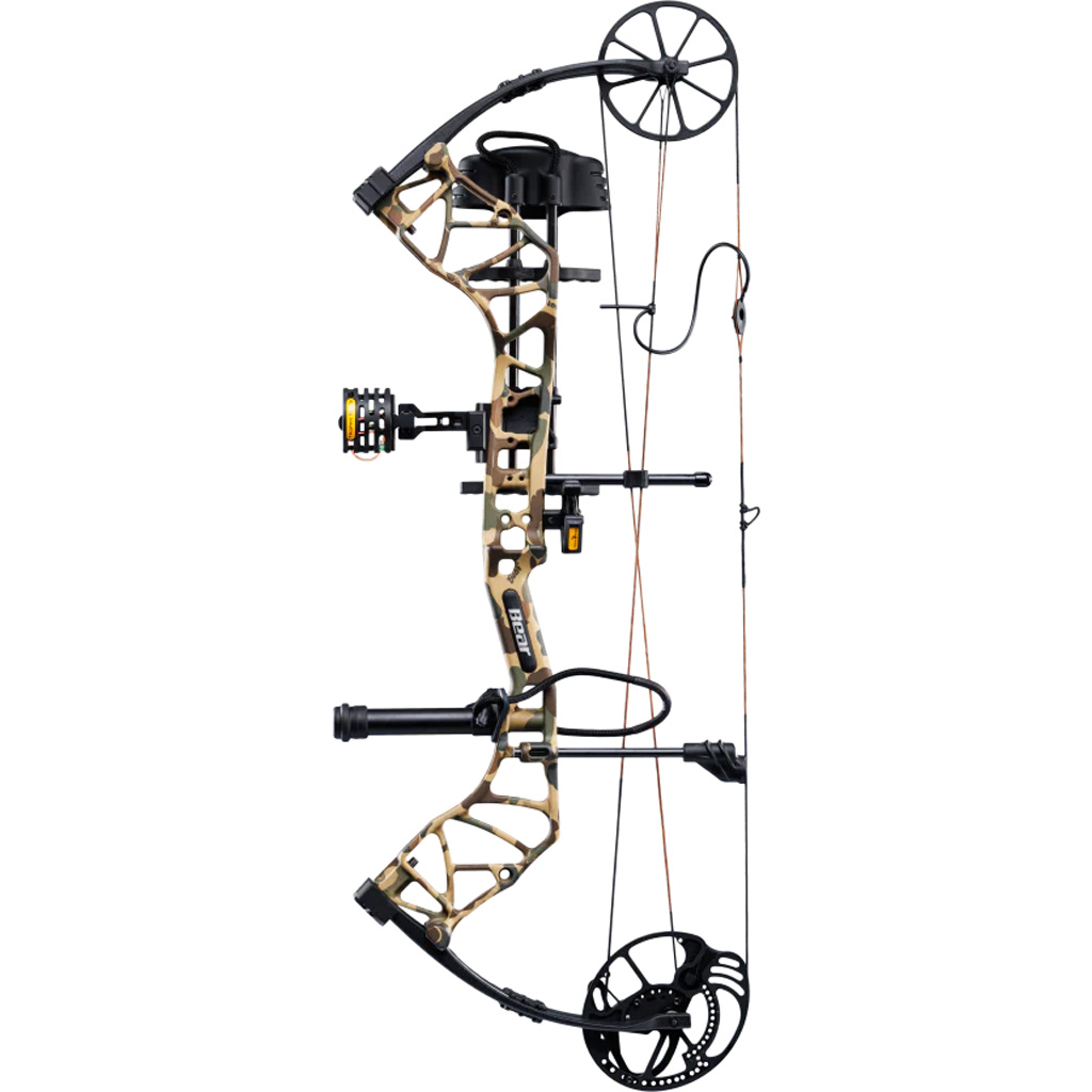 The Bear Species XT RTH Bow Package represents the next generation of single-cam bows, delivering unmatched performance and reliability. With a smooth-drawing single-cam system, the Species XT offers consistent accuracy shot after shot. It features an adjustable draw length of 23.5 to 30.5 inches and draw weight options of 45-60 or 55-70 pounds, making it suitable for a wide range of archers. The bow has an 80 percent let-off, a 30″ axle-to-axle length, and a 6.75″ brace height, balancing power and maneuverability. The Ready-To-Hunt package includes an IMS V-Biscuit rest, Picatinny-mounted 4-pin sight, 5 arrow quiver, stabilizer, peep sight, and wrist sling for a complete setup.