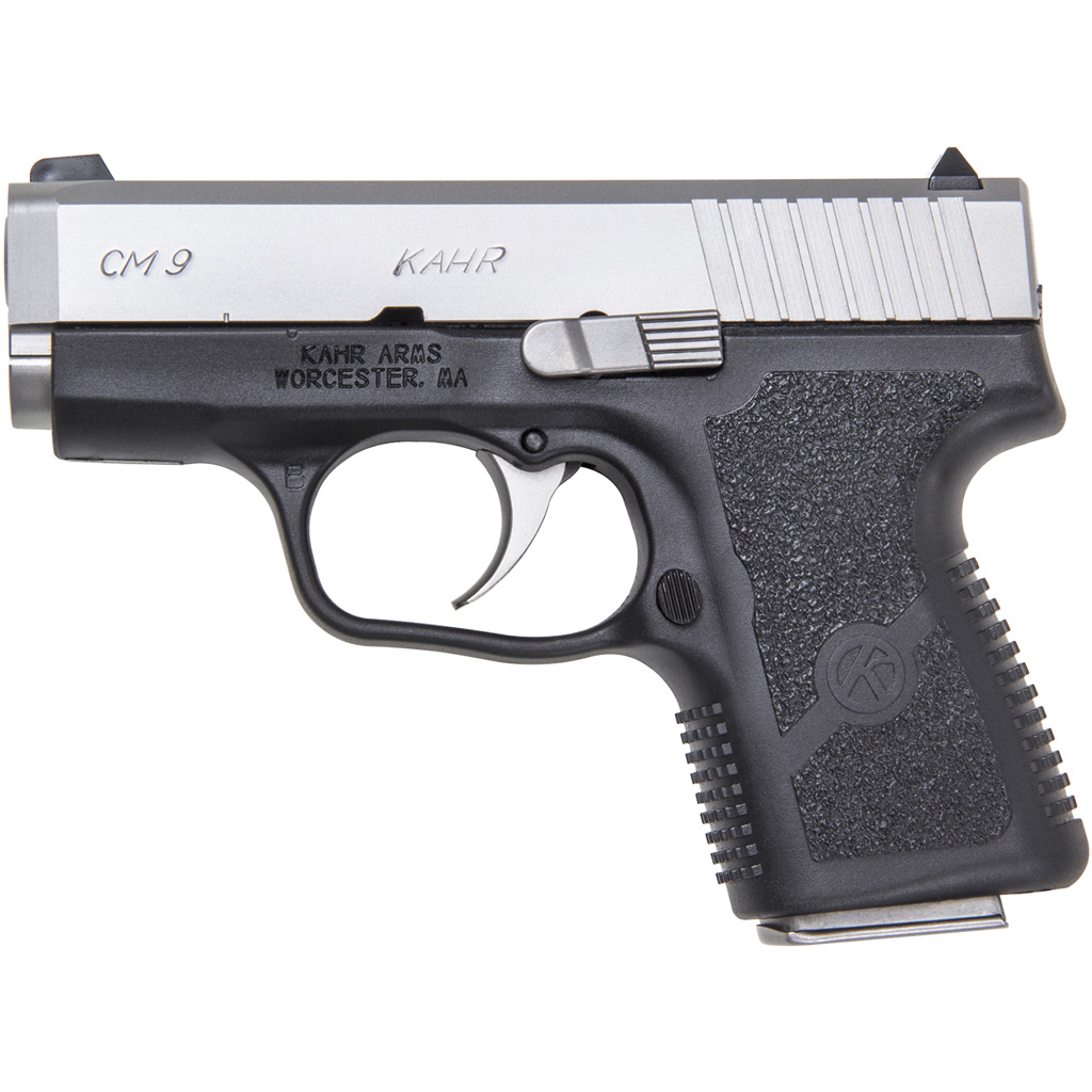 The Kahr CM9 Pistol structures a black polymer frame with a matte stainless slide and a textured polymer grip. The magazine holds a capacity of 6+1 rounds and features a trigger cocking DAO, lock breach, “Browning-type” recoil lug, and passive striker block and no magazine disconnect operation. This pistol is designed with a drift adjustable white bar-dot combat rear sight and pinned in polymer front night sight