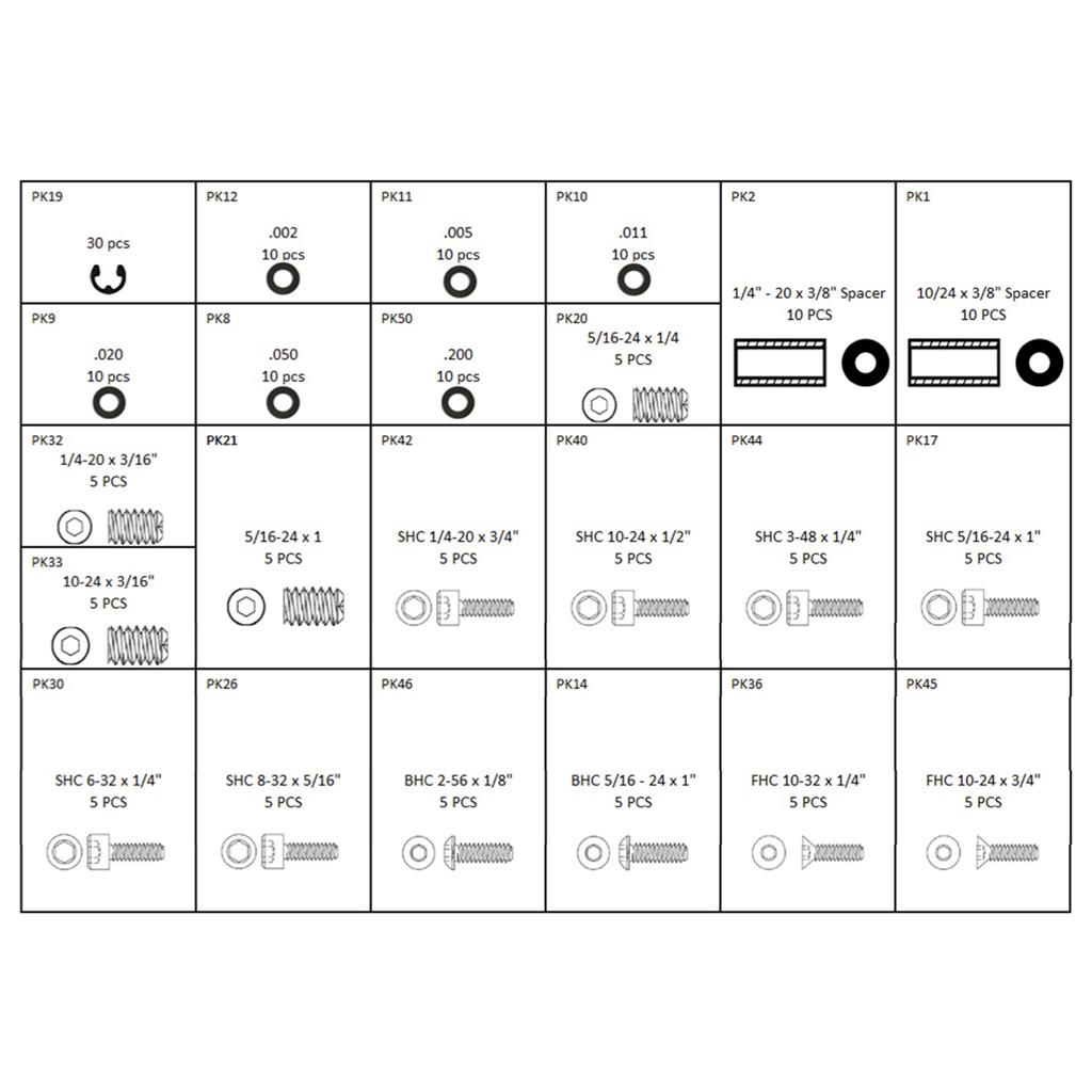 This kit is loaded with a wide variety of screws, bolts, stabilizer studs, e-clips, bolt spacers, cam spacers and much more in a wide assortment of shapes and sizes. Whether at home or on the tournament trail, you never know when you might need that one replacement part that this kit can supply. Kit contains 310 pieces.